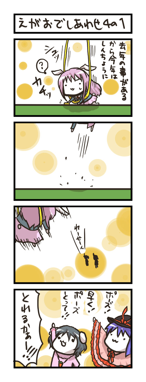 鏡餅に着くまでのうどんげとそれを見守る衣玖&てゐの一連の行動にほっこりしますねw。